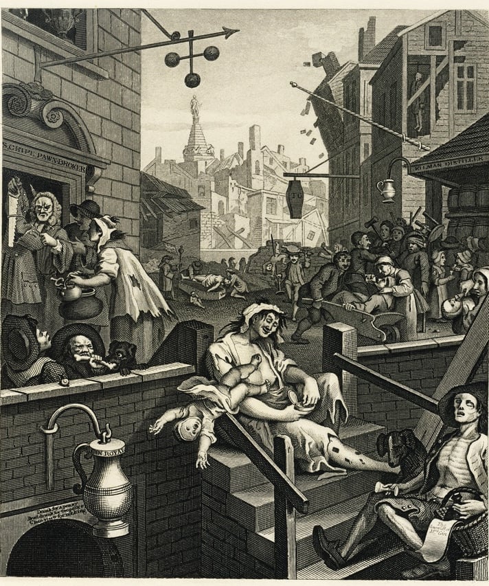 Una famosa incisione satirica che mostra gli effetti devastanti del gin sulla società londinese.